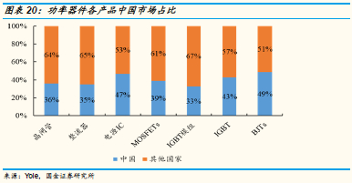 中国功率器件市场占比全球达40%:中国是全球最大的功率器件消费国,功率器件细分的主要几大产品在中国的市场份额均处于第一位。其中,MOSFET中国市场规模占比全球为39%,IGBT为43%,BJT为49%,电源管理IC为47%,其他如晶闸管,整流器,IGBT模组等等产品中国市场占比均在40%左右。