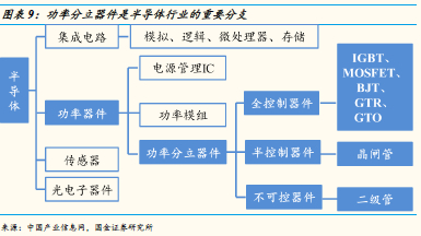 功率器件可以分为电源管理IC、功率模组和功率分立器件三大类,其中功率分立器件又可以分为全控制器件、半控制器件和不可控器件。