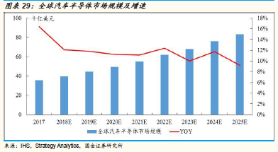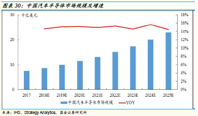 2017年,中国车用半导体市场规模75亿美元,占比全球车用半导体市场21.1%;预测2025年中国车用半导体市场规模将达到229亿美元,占比全球车用半导体市场提升至26.1%,17-25年复合增速为15%,高于全球增速。