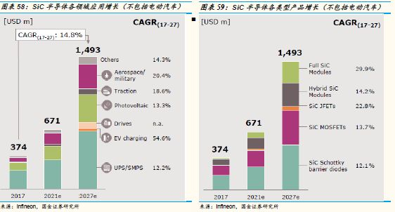 SiC半导体将快速增长,除电动汽车领域外,预计2017至2027年年均复合增速达到14.8%,增长最快的领域为充电桩,在各类产品中,全碳化硅模块及碳化硅结型场效应晶体管增长较快。