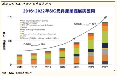 预测至2022年,SiC元器件的市场规模约10亿美元,2018-2020年CAGR为28%,而2020年之后市场规模加速增长,2020-2022年CAGR达到40%。