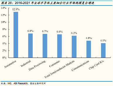 汽车半导体是汽车电子中的一个重要分支,16-21年全球行业复合增速达12.9%:2017年全球汽车半导体市场规模355亿美元,同比增长16.4%,在全球半导体产业中占比8.7%。国金证券半导体陆行之团队预测2021年全球汽车半导体市场规模将达到559亿美元,在半导体产业中的占比将提升至11.4%。2016-2021年汽车半导体市场规模复合增速12.9%,远远高于半导体行业的平均增速(6.2%,数据来源于IHS和ABI Research),以及其他主要的应用领域如工业领域(6.8%),数据处理(6.7%),消费(6.6%),通信(4.8%),智能卡(4.1%)等。