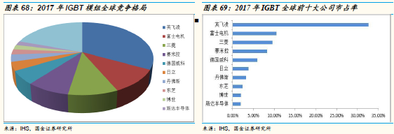 2017年,IGBT模组市场规模为26.3亿美元,英飞凌排名第一,市占率为32.6%,前五大公司合计占比达到66.9%。