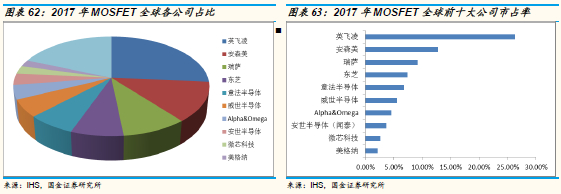 2017年,全球MOSFET市场规模达到66.5亿美元,英飞凌以绝对优势排名第一,市占率达到26.3%,前五大公司市占率达到62.5%。