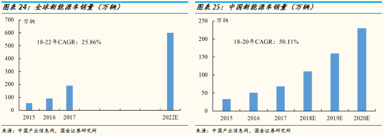 新能源车行业将进入高增长的成长期:2017年全球新能源车销量190万辆,其中中国新能源车销量68万辆。预测2022年全球新能源车销量将达到600万辆,18-22年销量CAGR达到25.86%,而2020年中国新能源车销量将达到230万辆,18-20年销量CAGR达到50.11%。新能源车将在全球范围内(尤其是中国)加速渗透。