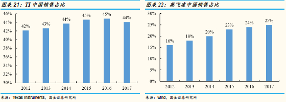 海外巨头对华功率器件销售逐年增加:全球功率器件IDM龙头企业在华的销售占比在过去几年也是稳步提升,目前第一大厂英飞凌中国销售占比从2012年的16%提升至2017年的25%,而Texas Instruments的中国销售占比也从2012年的42%提升至2017年的44%,进一步验证了国内功率器件市场的发展速度要明显快于全球平均速度。