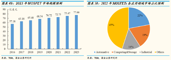 2016年,全球MOSFETs市场规模接近62亿美元,受益于汽车和工控领域的稳定增长,功率MOSFETs在汽车应用市场的市场占到整体的20%,超过了在计算机和数据存储应用中的表现。预计到2022年,随着新能源汽车销量的快速放量,功率MOSFETs在汽车应用市场占比将提升至22%,而计算存储和工控领域的市场占比则分别达到19%和14%,三者合计占到55%。