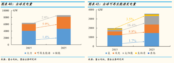 2015年全球发电量6414 GW,预计2025年全球发电量将达到8647 GW,10年CAGR为3.0%,其中可再生能源发电量增速较快,CAGR达到5.9%;进一步细分,太阳能发电和风能发电量的增速要高于可再生能源发电量的复合增速,太阳能发电量15-25年CAGR为16.4%,风能发电量CAGR为8.8%,远高于行业的平均增速。从地区来看,风电增长较快的地区包括中国,欧洲和美国,而太阳能发电增长较快的地区则有中国,欧洲,美国和其他亚太地区。