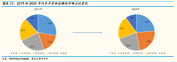 新能源汽车“安全”第一,安全系统半导体价值量占比提升:汽车半导体被用于汽车五大模块领域,包括车身、底盘、安全系统、驾驶信息和动力传动。随着汽车电动化和智能化的推进,未来半导体在安全系统模块中的用量将会显著增加,预计占比将从2015年的17%提升至2020年的24%;而动力传动模块、驾驶信息模块和底盘模块的半导体用量占比基本维持不变,2020年分别为22%、21%、10%;车身模块的半导体用量占比下降明显,从2015年的28%下降至2020年的24%。