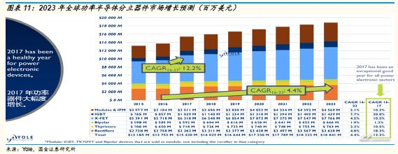 2017年,全球IGBT芯片和模组的市场规模约为37.3亿美元,Yole预测,2022年IGBT(含IGBT模组)市场空间将达到55亿美金,年均复合增长8.1%,主要的增长即来自于IGBT模组。