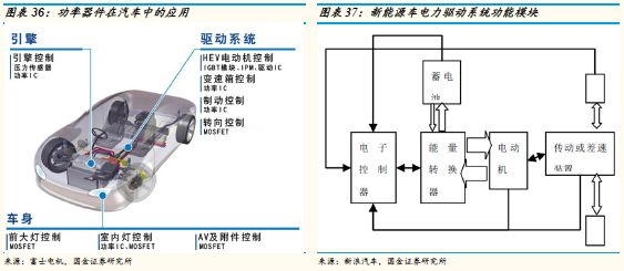 功率器件在汽车中的应用领域主要有:1)驱动系统:电动机控制、变速箱控制、制动控制和转向控制;2)引擎系统:引擎控制;3)车身:前大灯控制、室内灯控制、AV及附件控制。