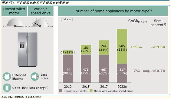 IHS统计,2017年全球家用电器销量约7.11亿台,其中4.67亿台为不可变频家电,占比达到66%,而可变频家电数量为2.44亿台,占比为34%。预计到2022年可变频家电销售量将达到5.85亿台,占比达到65%,17-22年销售量CAGR为19.1%,而不可变频家电销售量将下降至3.17亿台,占比减少至35%。