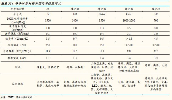 碳化硅:SiC是新一代宽禁带半导体,它具有热导率高(比硅高3倍)、与GaN晶格失配小(4% )等优势,采用碳化硅作衬底的LED器件亮度更高、能耗更低、寿命更长、单位芯片面积更小,且在大功率LED方面具有非常大的优势。此外,碳化硅除了用作LED衬底,它还可以制造高耐压、大功率电力电子器件如肖特基二极管(SBD/JBS)、绝缘栅双极型晶体管(IGBT)、晶闸管(GTO)、金属-氧化物半导体场效应晶体管(MOSFET)等,用于智能电网、太阳能并网、电动汽车等行业。