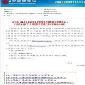 证监会表示,为进一步规范公开募集证券投资基金销售行为,维护投资者合法权益,促进行业健康发展,证监会会组织修订《证券投资基金销售管理办法》(证监会令第91号,以下简称《销售办法》),形成了《公开募集证券投资基金销售机构监督管理办法(征求意见稿)》(以下简称《销售办法(征求意见稿)》,并起草了《关于实施〈公开募集证券投资基金销售机构监督管理办法〉有关问题的规定(征求意见稿)》及《公开募集证券投资基金宣传推介材料管理暂行规定(征求意见稿)》两个配套规则,现向社会公开征求意见。