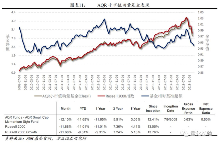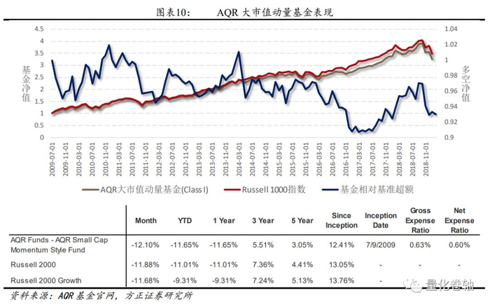 5、以AQR基金为例,09年发行的两款美股公募动量基金均未能跑赢基准,市场残存微弱的动量效应似乎被交易成本、管理费等费用完全侵蚀了。