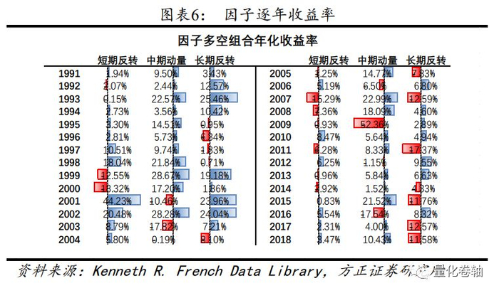 以下统计逐年收益,和上文结论类似。中期动量看起来最为诱人,轻易不会撤,一旦回撤可能极具杀伤力。如2009年,因子多空组回撤超过52%,跌去10年收益。