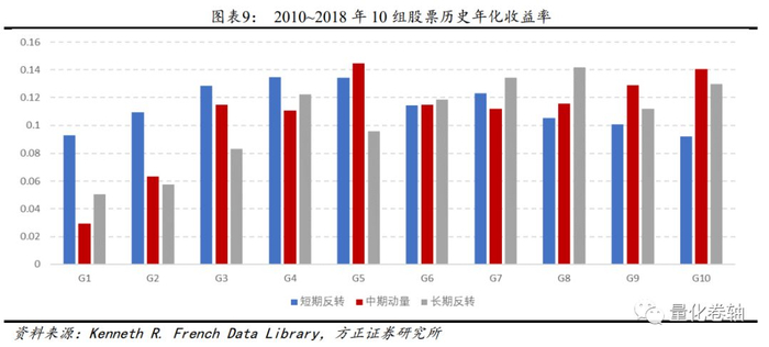 (3)而正好相反的趋势是,代表中期动量的红色条形逐组递增。前中期低收益组合(红色G1)年化收益率为-1.61%,最高收益组合(红色G10)年化收益为16.47%。这种同向趋势体现了中期动量效应。