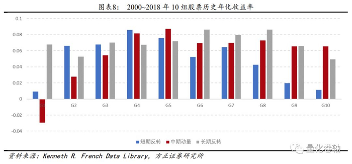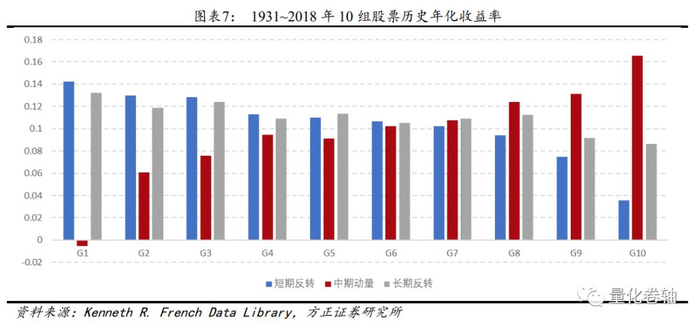 (1)在1931~2018年间,代表短期反转的蓝色条形逐组递减,前短期收益高的组合(蓝色G10)在后期表现反而会显著低于前短期低收益组合(蓝色G1),体现了明显的短期反转效应。