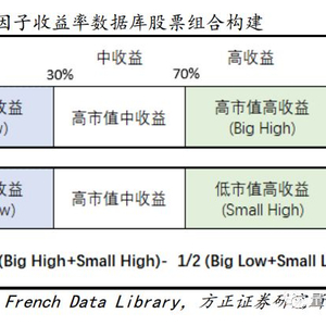 在因子收益率数据库中,French利用1931年至2018年的股票历史数据构建了三个回望窗口,分别为前1月短周期、前2~前12月中周期、以及前13~前60月长周期。每个回望窗口又分别对应了日、月、年三个预测窗口。预测窗口为日度时,组合每日调仓;预测窗口为月度,组合每月调仓;预测窗口为年度时,组合每年调仓。