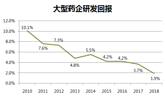 但是现在,整个制药行业都开始面对一个新难题:德勤2018年12月的研究显示,2010年以来,生物制药公司的研发回报率节节下滑,2018年头部12家药企的回报率降低到只有1.9%。