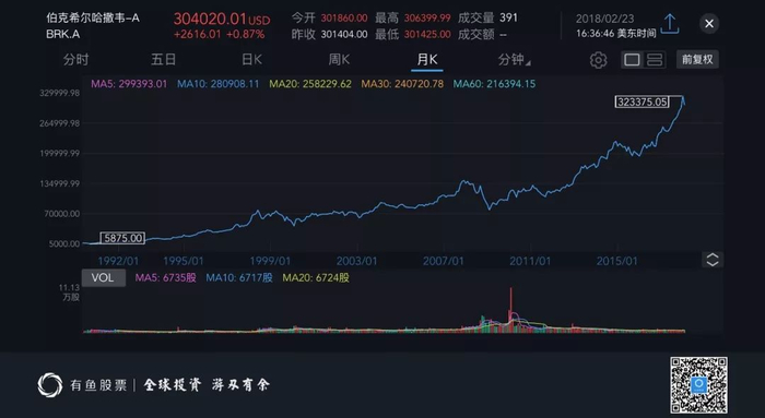 1964年,伯克希尔哈撒韦的股价16美元一股,现在30万美元一股,翻了近1万9千倍。