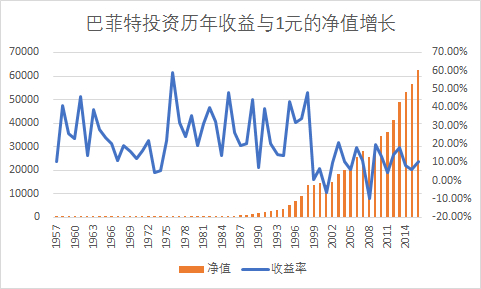 除了2001年和2008年收益率为负(分别为-6.5%和-9.6%),其余年份他都实现了正收益。截止2017年底,伯克希尔的资产增长了10880倍,年化增长率达到19.1%。
