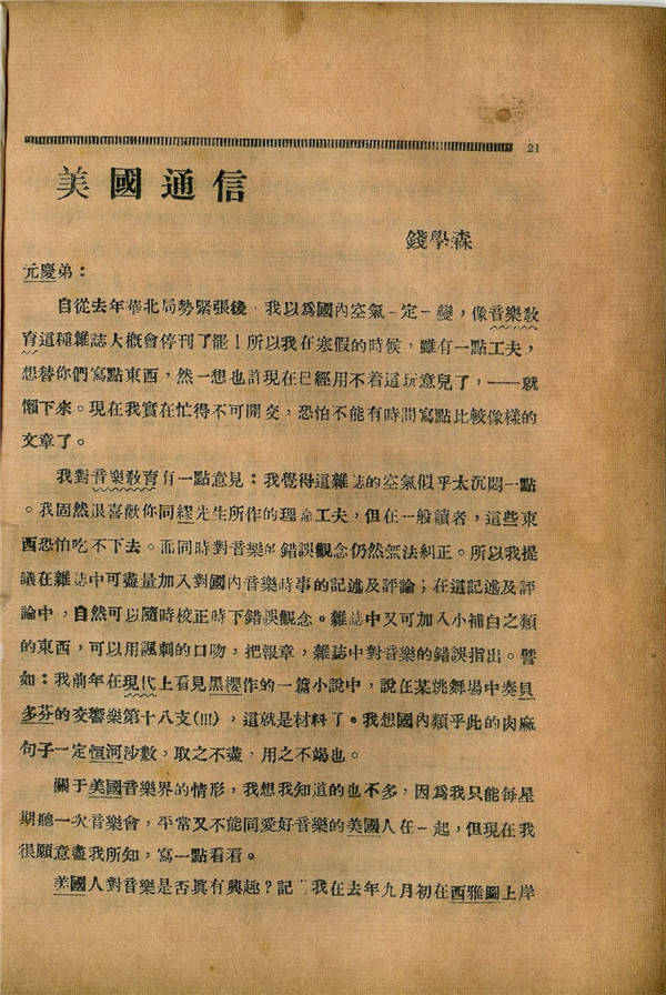 这封刊发在《音乐教育》上的信,共有五个版面,约2500余字;主要写了三方面内容:一、对《音乐教育》的看法;二、介绍美国音乐界的情形;三、介绍歌剧在美国的情况。下面,不妨将其主要部分摘录如下。