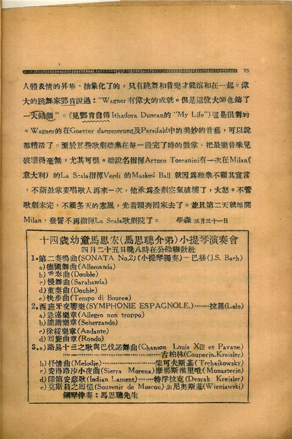 我个人对歌剧是无好感的,我觉得音乐是一种最抽象的升华了的艺术,而戏剧是现实的物质的,因为这种根本的差别,要想把他们溶和起来作成一种新艺术——即Wagner`s Musicdrama是不可能的。只有跳舞(艺术跳舞)才配合音乐在一起,因为跳舞是人体表情的升华,抽象化了的,只有跳舞和音乐才能溶和在一起。伟大的跳舞家邓肯说过:“Wagner有伟大的成就。但是这位大师也铸了一个大错。”(见邓肯自传Ithadora Duncan的“My Life”)这是很对的。Wagner的在Goetter Daemmerung及Parsifald中的美妙的音乐,可以说都糟蹋了。至于那些歌剧听众在每一段完了时的鼓掌,把最乐音味儿破坏得毫无,尤其可恨。