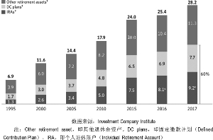 随着美国经济增长以及社会收入水平提高,美国养老资产的规模也持续增长。在1995年至2017年期间,美国养老资产的规模从6.9万亿美元增长至28.2万亿美元,平均年度增长率为14%,增速超越了美国GDP增速。