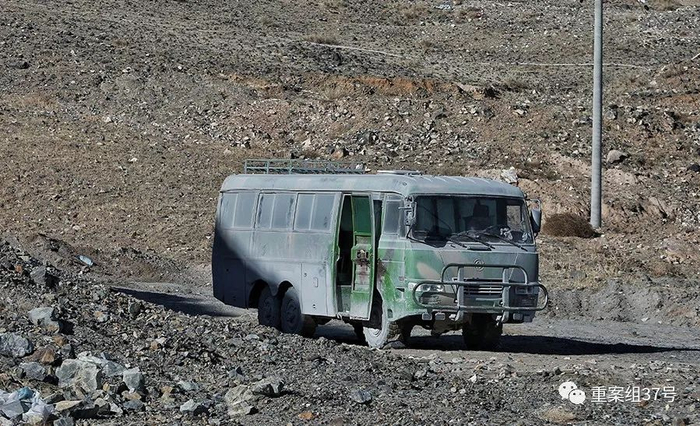 新京报记者在银漫矿业公司外的东侧山坡下,发现一辆绿色大巴车,经目击者指认,确认该车与事故车辆结构相似。这辆大巴车外观老旧,且并未悬挂牌照,生产厂家为东风特种汽车有限公司。车辆宽约三米,长约十米,有六个轮胎。车身整体为绿色迷彩样式,车顶上有置物铁架,车门处显示编号“160”。