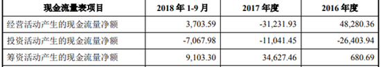 现金流量表显示:翰博高新2016-2017 年度及 2018年前三季度经营活动产生的现金流量净额分别为 4.83 亿元、-3.12 亿元、0.37 亿元。经营活动现金流量净额极不稳定。