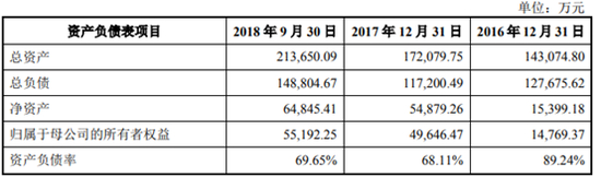 翰博高新资产负债率2016年-2018年前三季度分别达89.24%、68.11%、69.65%,濮阳惠成资产负债率分别为12.28%、18.50%、14.27%,翰博高新的资产负债率较高且远高于濮阳惠成;下图为翰博高新的资产负债项目表。