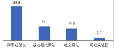 在中小学生的现实交往中,网络游戏是很受欢迎的话题,他们非常乐于通过游戏用语来表现自己的玩家身份和对网络游戏文化的了解,并由此体验到群体归属感。报告中显示,超过八成(83.8%)中小学生通过同学或朋友了解到网络游戏信息,在各渠道中占绝对优势。