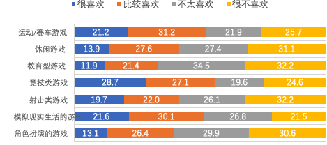 在喜欢的游戏类型方面,男生和女生也存在着较大差异。男生最喜欢的是竞技类、赛车/运动类及模拟现实类游戏,而女生则更偏好休闲游戏。