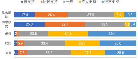 另外报告中也发现,最为支持中小学生玩网络游戏的群体是同学朋友,其次是兄弟姐妹,最后是父母老师。作为老师,对于游戏的态度相对更为坚决,比父母更不支持孩子玩游戏,老师们担心玩网络游戏会影响学生的学习成绩、上课状态和学习行为等。