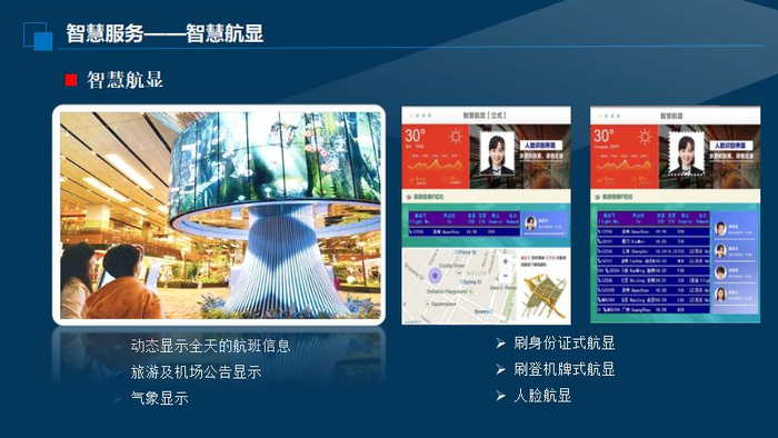 多功能智能航班显示系统是基于人脸识别系统的人性化设计理念开发而成,主动识别当前旅客身份,突出显示该旅客的航班信息及状态,并提供个性化信息提示及登机口导航还能够为机场旅客提供气象报告、旅游导向、新闻报道等实时信息,有助于提升机场的运行服务质量。航显系统主要分为气象模块、人脸识别模块、智能航显模块、广告模块、旅游及机场公告模块,根据需求设置个性化服务显示。