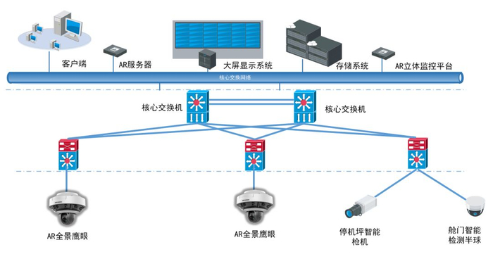 飞行区AR智慧监控系统集前端、管理平台、存储、显示设备于一体。系统以iVMS飞行区AR立体监控平台软件为核心,采用AR技术,将大场景监控与飞机状态智能识别合为一体,并与机场A-CDM系统进行数据交互,实现机场飞行区域安防业务集中管理,在控制中心即可对前端系统集中监控、统一调度,为机场正常运行保驾护航。