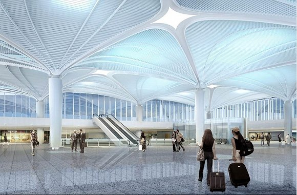 综合交通无缝换乘“空路一体”青岛胶东国际机场GTC项目效果图。