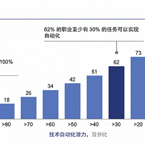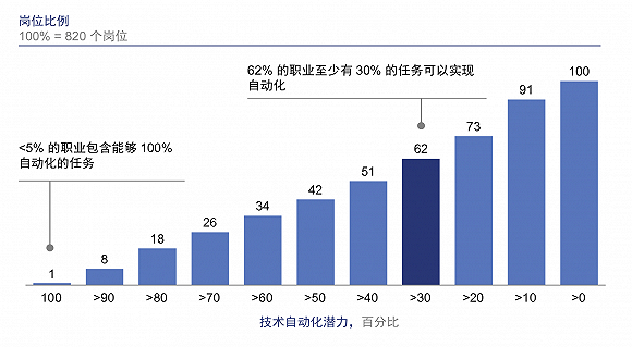 在麦肯锡经过调研形成的报告《工作岗位的流失与获取:自动化时代的劳动力过渡》中显示,基于当前技术,只有不到5%的职业会百分之百实现自动化。(图1)