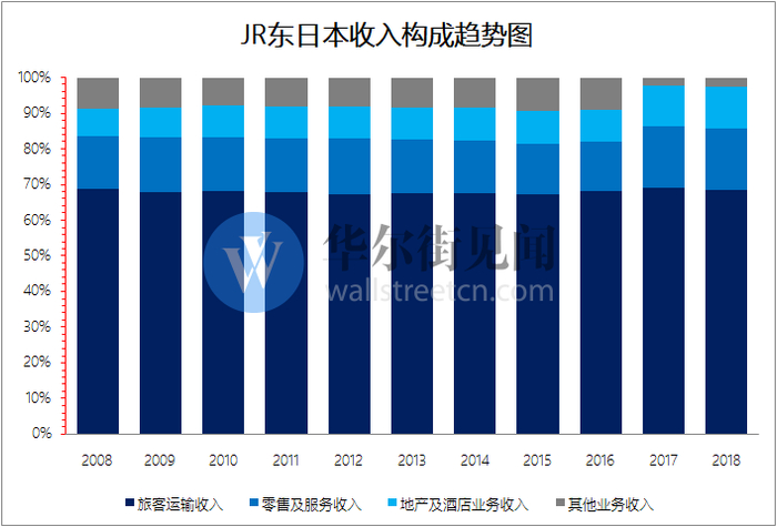 JR东日本的财报中将其收入分为运输服务收入、零售及服务收入、地产及酒店业务收入和其他业务收入。在最近一个财年,后三项收入的增速均显著高于旅客运输业务收入的增速。在最近十年中,JR东日本超过三成的营业收入来自非运输服务收入,而且占比相对稳定,为该公司提供了丰厚的回报。