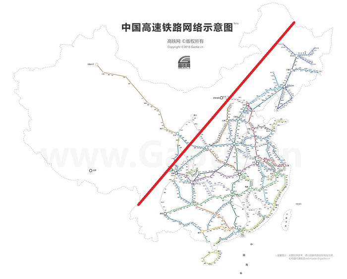 中国高铁线路网络和“黑河—腾冲人口线”示意图,底图来自高铁网