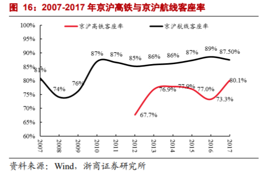 据浙商证券杨云团队统计,京沪高铁的上座率已经从开通之初的67.7%提升至2017年的80.1%,并且一路直逼京沪空中快线的客座率。不过随着大载客量列车普遍投入使用、列车密度增加以及运行速度提高,京沪高铁依然有一定的增长空间。