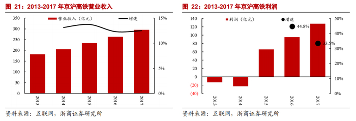 浙商证券研报指出,京沪高铁公司营业收入从2013年的182亿元提升到2017年的296亿元,年均复合增长率近13%,净利润从亏损12.9亿元到盈利127亿元,利润率由负转正至42.9%。