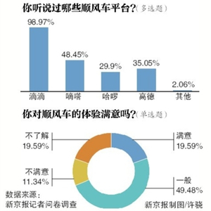 新京报记者做了一项随机问卷调查显示,用户“使用顺风车常遭遇哪些不便”的多选题中,“打不到车”占28.87%,“路线匹配不高、耗时长、车主随意取消订单”占24.74%。
