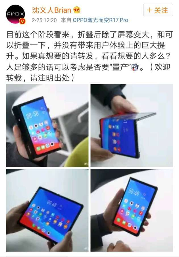 沈义人还表示,OPPO在短期内没有商用折叠屏产品的考虑,不过他也展示了OPPO内部的折叠屏概念机。2月25日中午,沈义人在微博发布了OPPO可折叠屏样机组图,从图片上看,改款机型采用了跟华为Mate X类似的屏幕外折方案。