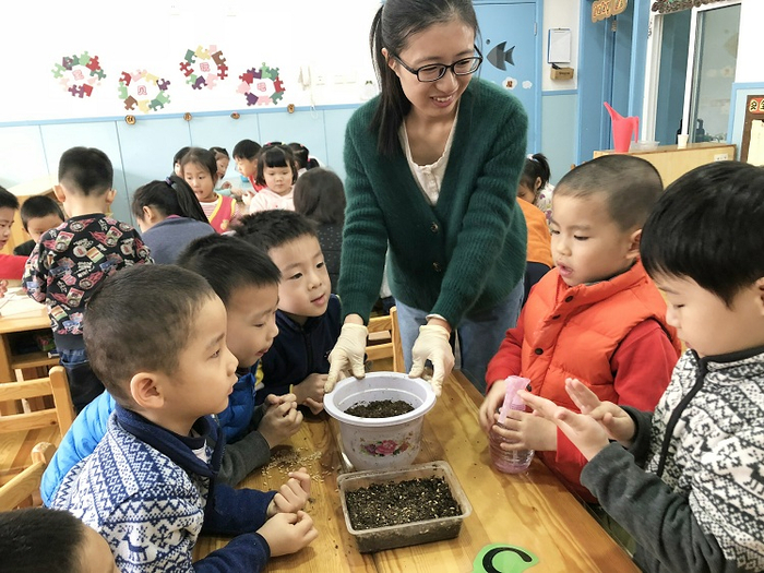 陈华为孩子们讲解种花种草知识。受访者供图