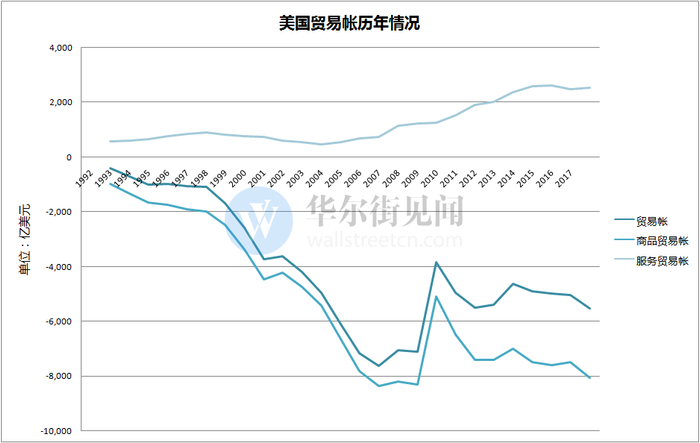自1971年以来,美国总体上处于贸易逆差状态。据美国商务部数据,2017年美国货币和服务贸易赤字上升到5523亿美元,创九年新高,是自从2008年美国创下7087亿美元贸易赤字以来的最高水平。