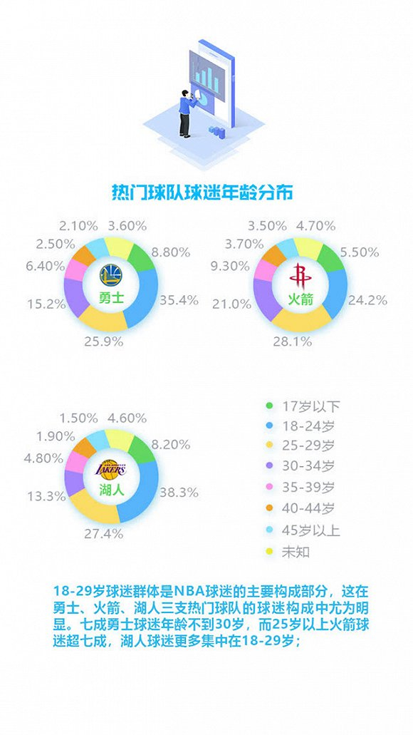 根据统计,17岁以下和18-24岁年龄段的球迷,最关注的球队是勇士。25岁以上的球迷,最关注的球队是火箭。