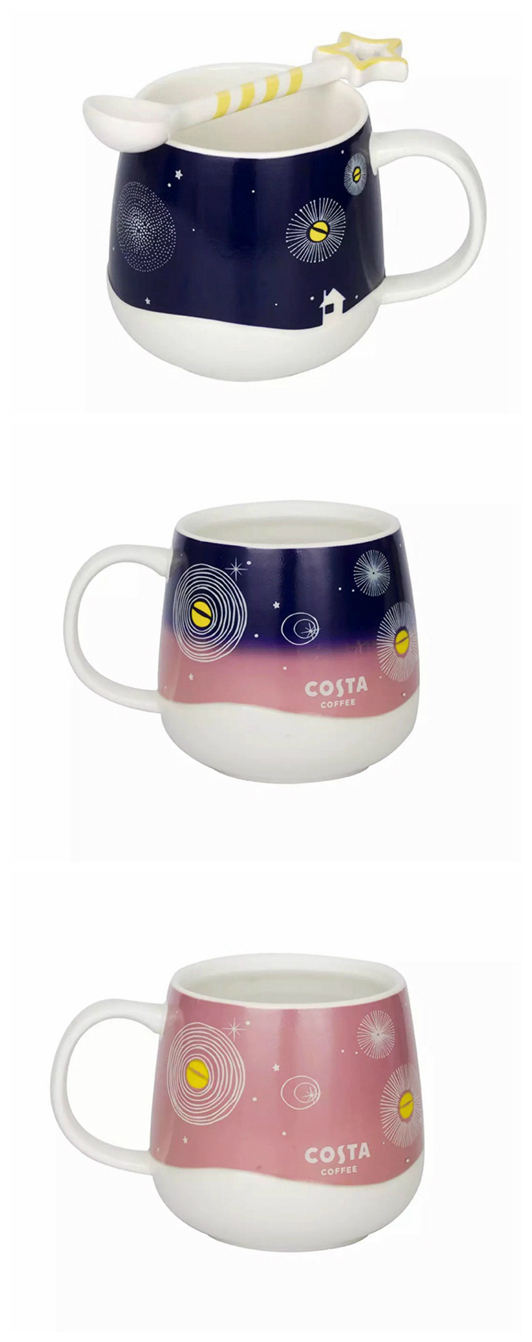 COSTA这款马克杯杯身光滑圆润,覆以白雪皑皑的地平线与点缀着闪耀星光的深蓝色夜空相接,自带的星辰小勺,趣味的造型和杯子的图案交相呼应。倒入热水,杯身会变成粉色,梦幻少女感十足。
