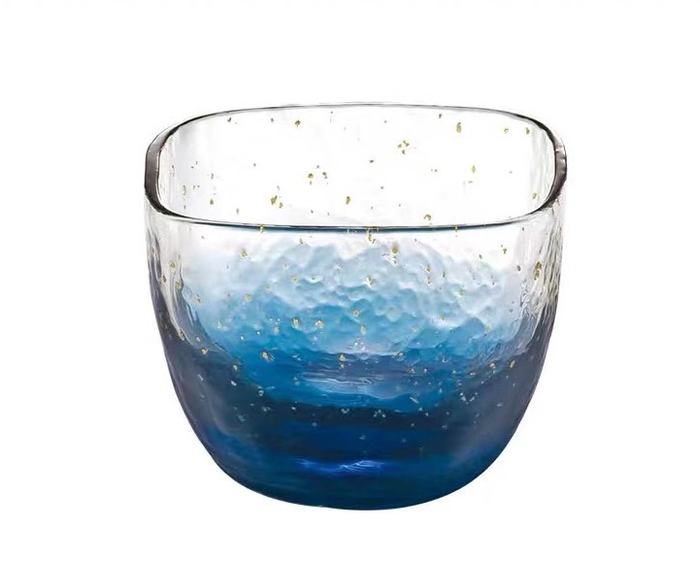 蓝色从杯底向杯口逐渐变浅,仿佛是星空化作了杯底的沉淀,伴随着凹凸的纹理,细碎的金箔点缀其中,让这款杯子有了如同星空的美,仅仅摆在桌上,也犹如一件工艺品。